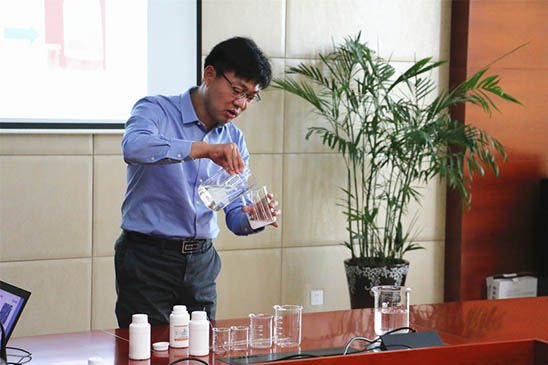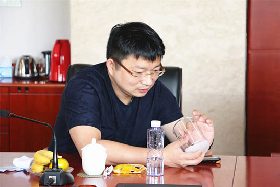 他还现场演示了SAP的吸水性实验,让大家近距离接触我们的产品,实验结束后,大家对这个刚接触的“新产品”都充满了好奇,纷纷提出了自己的疑问,孙董都耐心地给大家一一解答。最后大家都对高速、高强、反复吸水的SAP发出感叹:小颗粒,大作用!